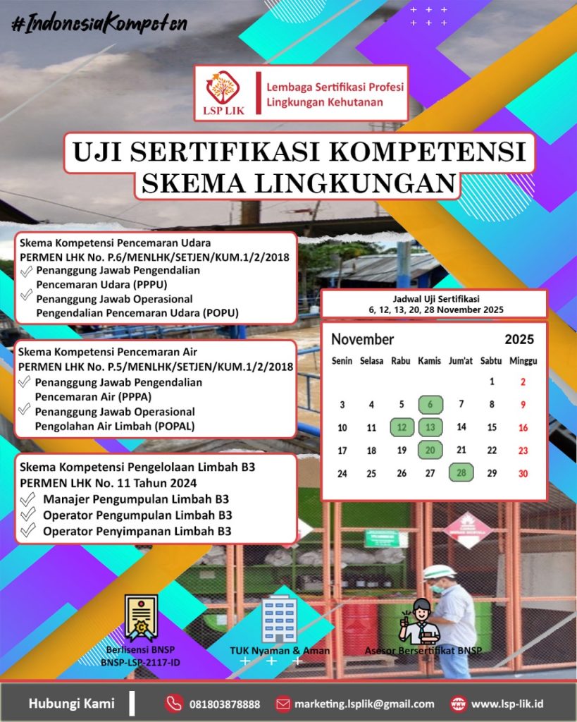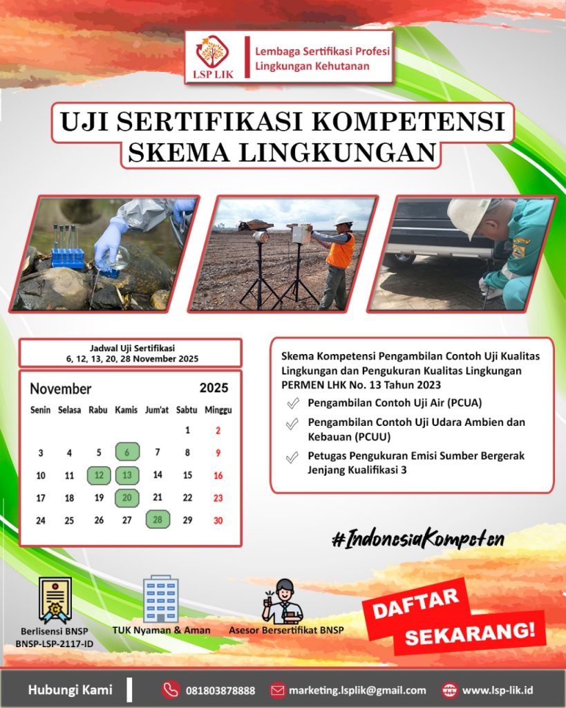 LSP LIK bertujuan untuk melakukan sertifikasi sumber daya manusia telah mendapat dukungan dari KEMENTERIAN LINGKUNGAN HIDUP DAN KEHUTANAN REPUBLIK INDONESIA (KLHK RI) dengan Sertifikasi Registrasi Nomor : SF. 161/BP2SDM/SET/PEG.15.1/B/08/2024 untuk mengembangkan standar kompetensi, melaksanakan uji kompetensi, menerbitkan sertifikat kompetensi BNSP serta melakukan sertifikasi di Tempat Uji Kompetensi (TUK).